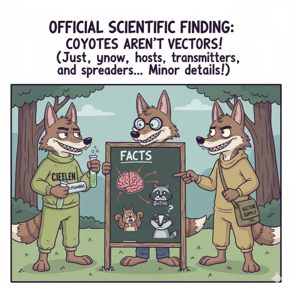 Not a vector for rabies: In the April 28, 2022, issue of The Lake Report, Sampson is quoted “coyotes are not vectors for rabies.” This statement is flat-out wrong. According to the Government of Ontario, coyotes are susceptible to the rabies virus and can transmit it, though infections are uncommon. The rabies virus can infect any mammal and is spread through contact with the saliva or nervous tissue of an infected animal. While coyotes are not a major vector compared to species such as raccoons, skunks, foxes, and bats, “rare” does not mean “nonexistent.” Misrepresenting this risk undermines public health messaging and conveys a false sense of safety regarding a disease that is generally fatal once symptoms appear.