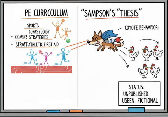 It’s obvious that a program designed to train future Physical Education teachers would not—and did not—require a thesis on an entirely unrelated topic like wildlife behavior. The so-called thesis Sampson cites simply does not exist: it has never been published, no one has seen it, it is entirely fictional. This makes sense when you consider the things Sampson has said about coyotes over the years, ranging from verifiably false to utterly ridiculous.
