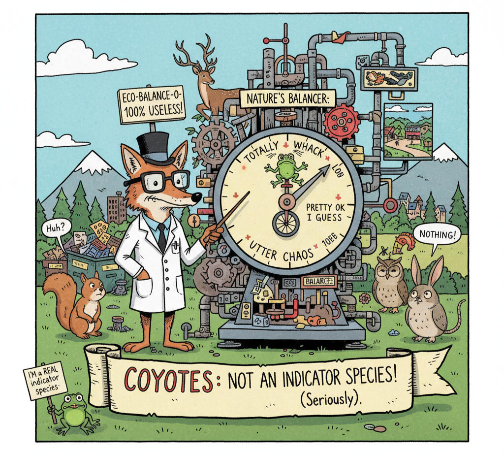 Indicator Species: Sampson claims coyotes “indicate whether we’ve got the balance of nature right” misuses the term “indicator species,” which refers to organisms whose presence or absence reflects specific environmental conditions (e.g., amphibians indicating water quality). Coyotes are highly adaptable generalists, not reliable indicators of ecosystem health, as they thrive in diverse conditions, including urban and natural environments. This misuse further demonstrates a lack of precision in scientific communication.